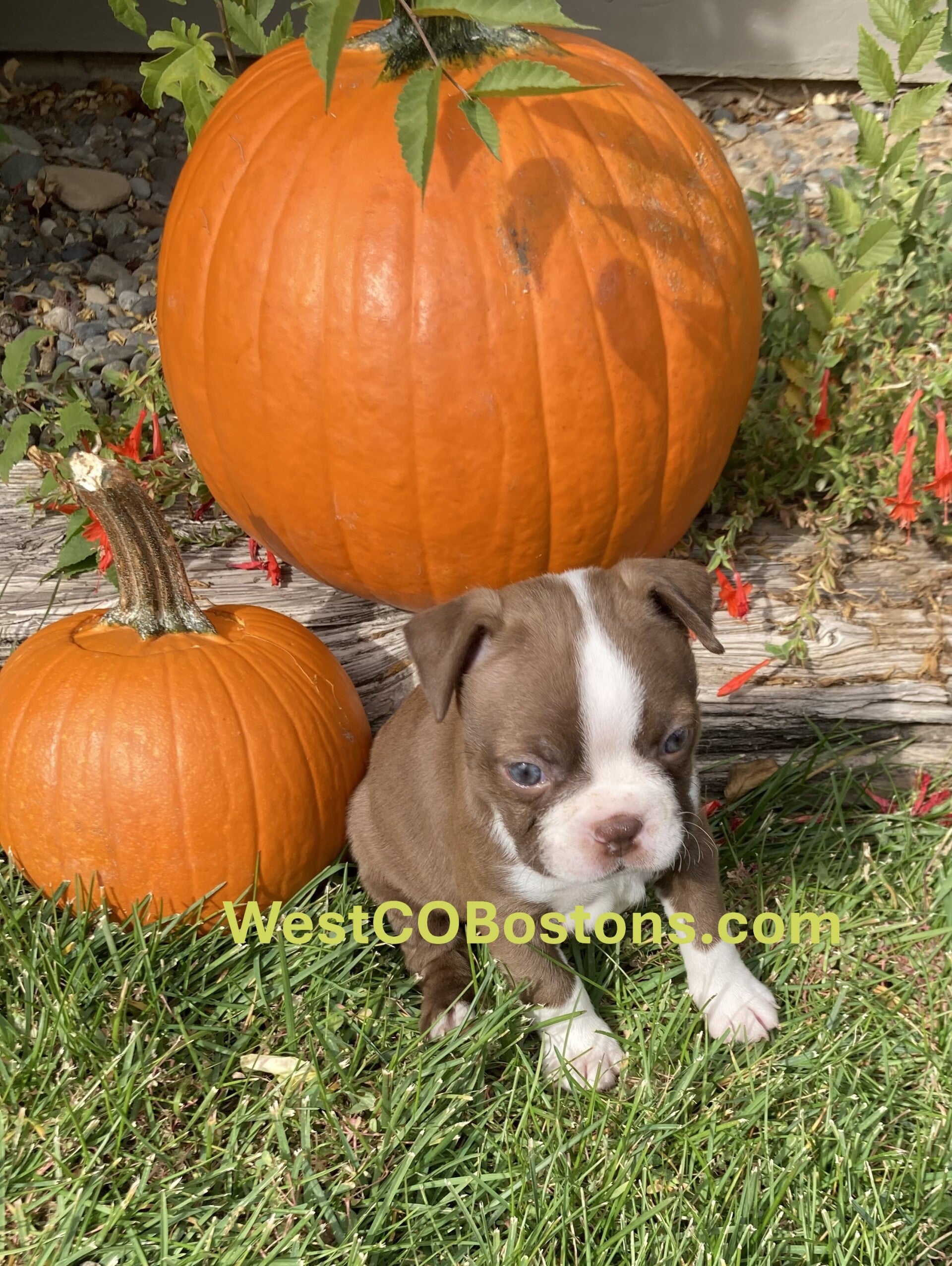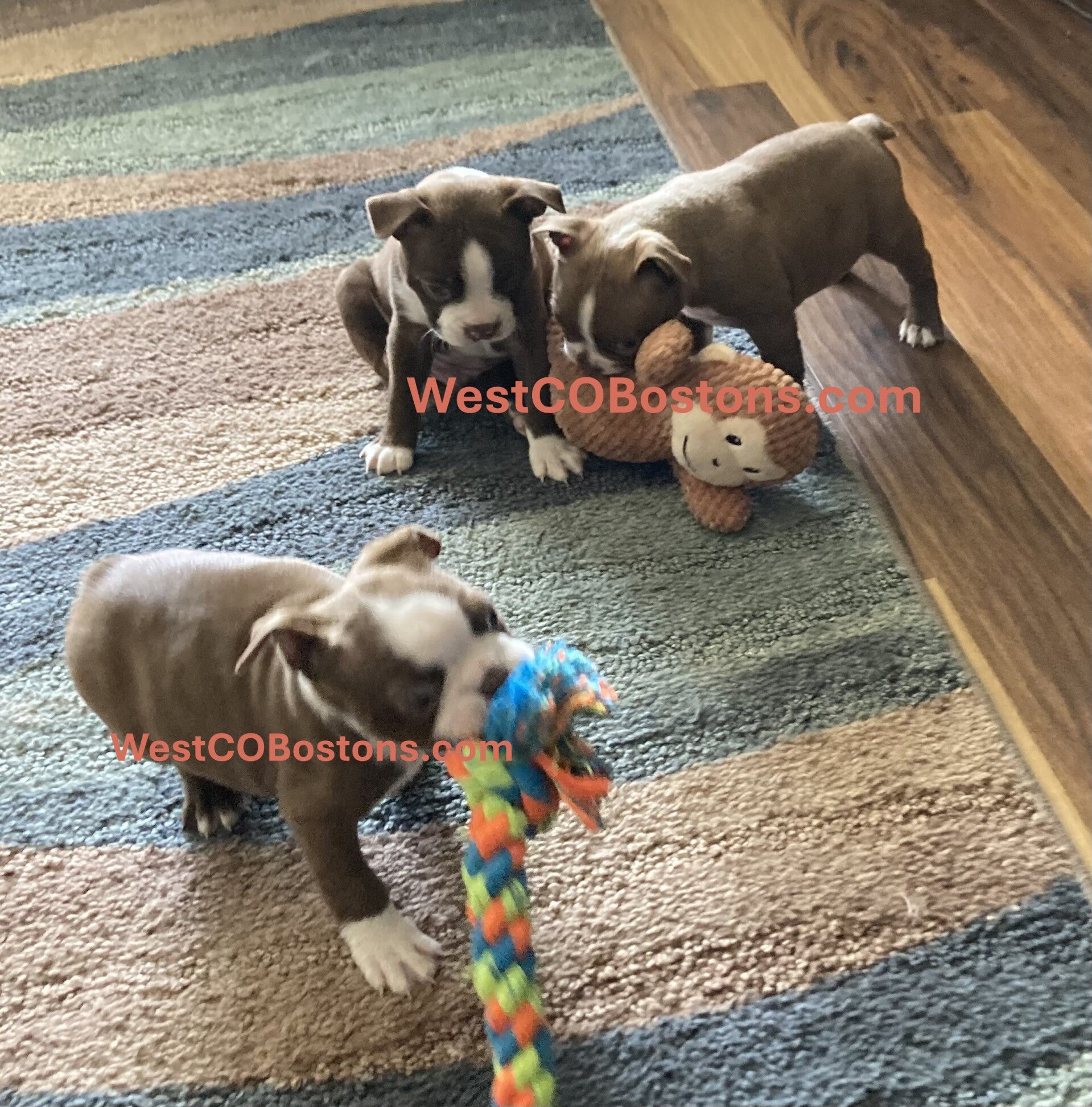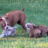 Hiccup is 4 years old, very sweet, lively and funny. He is much smaller than Mocha at only 12 lbs., black and white with some really pretty gold brindling. He is obsessed with balls and will play fetch until your arm falls off. Previous puppies sired by Hiccup are about 20 lbs. adult weight, with typical muscular Boston Terrier builds. His puppies are black and white with varying amounts of brindle, and all have very sweet, lively, affectionate, friendly temperaments. He is a great daddy dog and likes to show the puppies how much fun balls are.